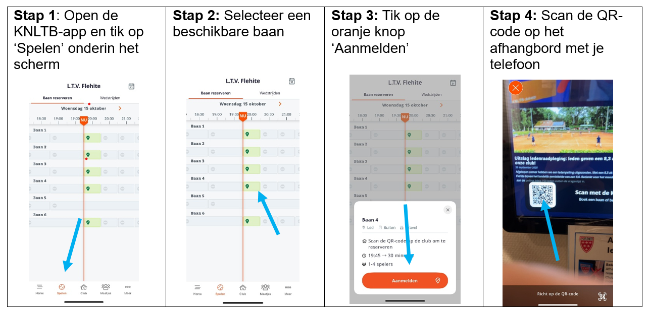 Om een baan te reserveren moet je vanaf de KNLTB-app op je telefoon hebben. Dus zonder telefoon met deze app is het niet mogelijk om een baan te reserveren.